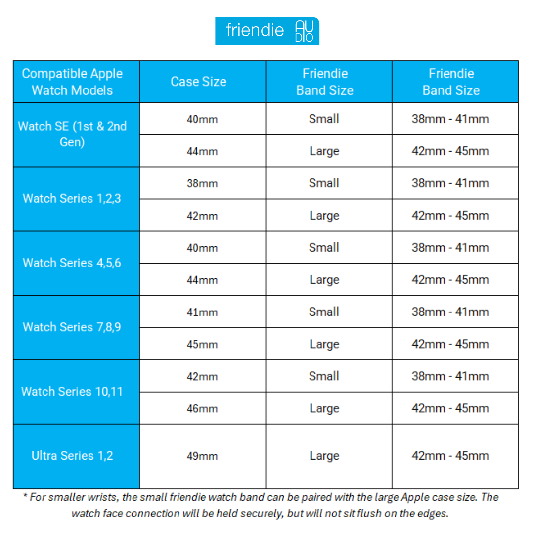 • See sizing chart for Apple case size to Friendie band size
